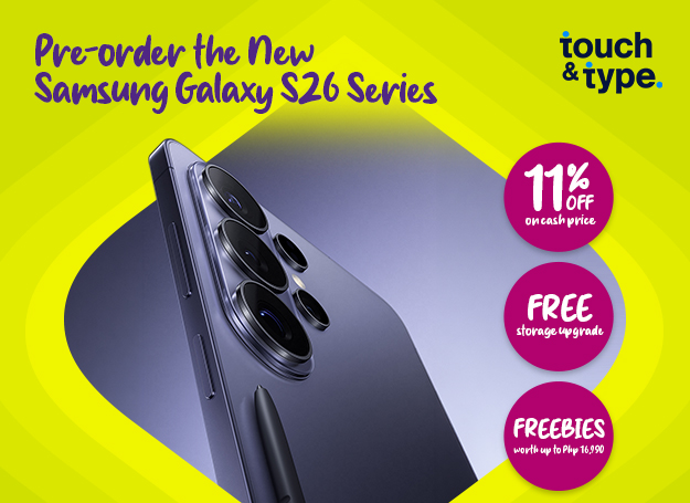 Pre-order the new Samsung Galaxy S26 Series at Touch and Type and enjoy 11% OFF on cash price + 0% installment offers with your EastWest credit card.